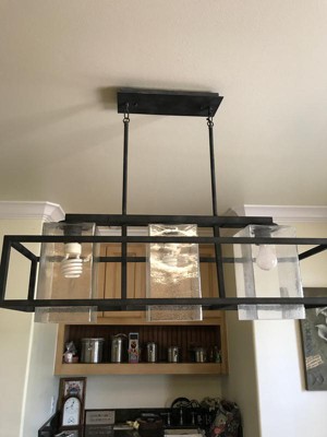 [This review was collected as part of a promotion.] The 3 Light Outdoor Linear Chandelier from the Wright collection is so beautiful over a kitchen island. I installed this beauty today and I am so impressed with the square glass shades, geometric framework and Weathered Zinc finish. It was SUPER easy to install and came with everything you need, besides the light bulbs. It is quite a site to see. I can't wait to show it off to my friends and family.
