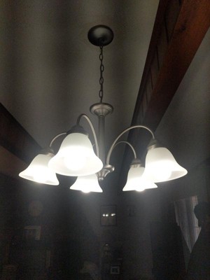 With a straightforward, contemporary design scheme firmly in place, the Wynberg(TM) Collection is a line of lighting that leaves nothing to chance. The simplicity of the Wynberg(TM) profile is accentuated by our high quality Brushed Nickel finish for a clean, timeless look. The satin-etched glass adds wonderful frosted ambiance and a fine contrast in texture. The 5-light chandelier uses 100-watt (max.) bulbs and measures 24.5in. in diameter with a 14in. body height. It includes 57in. of extra lead wire with 6' of chain. Back Plate Height: 5.00 Back Plate Width: 5.00 Chain Length: 36.00