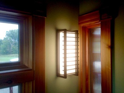 [This review was collected as part of a promotion.] Beautiful exterior wall sconce that looks just as good indoors. This fixture is very high quality. Substantial case metal frame wrapping around a frosted glass pillar. Perfect fit and finish. The permanent LED emits a very slightly warm and very even light through all sides of the fixture. One drawback of permanent LED's is that you are stuck with one light output unless you choose to operate this fixture with an LED dimmer switch. It would be nice to see a manufacturer give you a bright and dim option with either a small switch or choice of hot wires on installation. But a big offset to that drawback is the even light distribution and the completely sealed glass portion of the light. I installed two on either side of a jacuzzi alcove. The vertical light has nice repetitive horizontal bars which give it a "Prairie Style" or "Mission" feel. Would look very at home in a modern interior or exterior as well.