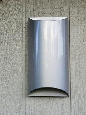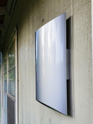 This simple but sleek and stylish, tall, modern outdoor LED wall light has a versatile look that's perfect for a wide range of homes. A half-cylinder metal two-light design with a half-moon open top and bottom silhouette, it's finished on the outside in brilliant platinum, and inside with sandblasted glass to optimize reflectivity. This energy-efficient exterior fixture from Kichler is ADA compliant.