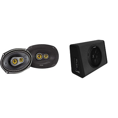 This bundle includes a Kicker 11PT250 BassStation 10" Powered Subwoofer, Kicker 50CSC4104 4x10" Coaxial Speakers, and Kicker 46CSC6934 6x9" 3-Way Speakers.