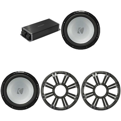 This bundle includes a Kicker 51KPX5001 KPX500.1 500-Watt Powersports & Motorcycle Subwoofer Amplifier, a Kicker KMF12 12-inch Weather-Proof Subwoofer, and a Kicker KMG12 12-Inch Grille for KM12 and KMF12 Subwoofer, LED, Charcoal.