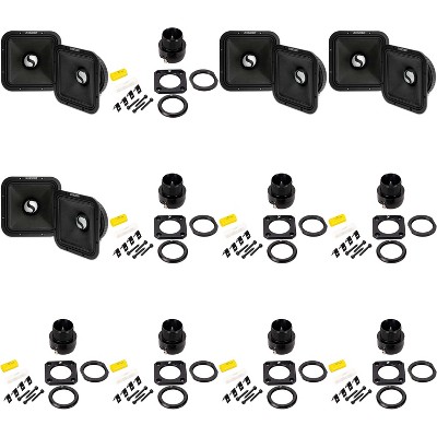 This exclusive bundle features top-notch car audio equipment including 3x Kicker 49ST9MR4 9" Street Series Square Mid-Bass speakers and 6x Kicker 49ST3TW ST3TW 1" Street Series Dual Mount Bullet Tweeters. Designed for competition-level SPL systems, these speakers deliver exceptional clarity and power. The 9" mid-bass speakers boast 300 watts RMS power handling and a wide frequency range of 80-5.5k Hz. They feature a square cone design for increased output and high sensitivity, perfect for vocals in loud environments. With a 4-ohm impedance and 600 watts peak power handling, the mid-bass speakers are a standout choice for audiophiles. The 1" bullet tweeters offer 106 dB sensitivity and a frequency response of 3.5k-20k Hz. Featuring an aluminum dome and horn-loaded design, these tweeters excel at delivering clear vocals to complement high-output bass. With an included trim bezel for surface mounting and spring-loaded terminals, installation is a breeze. The tweeters can handle up to 100 watts of peak power and come with in-line 6dB crossovers for seamless integration. Upgrade your car audio system with this powerful and dynamic bundle from Kicker.