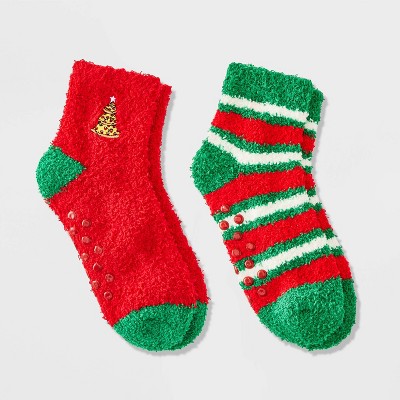 Kid's Embroidered Candy Canes Christmas 2pk Cozy Ankle Socks with Grippers - Black/Ivory/Red 2-5