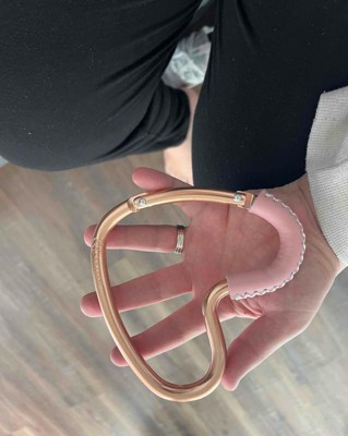 [This review was collected as part of a promotion.] I love this stroller clip. The heart shape is so sweet and feminine. The metal is rose gold color which is perfect to compliment the pink gripper. The opening is smooth and easy and wide enough to easily attach to the stroller. It's sturdy and stays in place and holds many bags. Overall I highly recommend this clip. It's beautiful and practical and a great addition to hang your bags and keep your stroller storage compartment free. Great clip! I received an incentive to write this review.