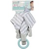 Our soft, plush Teething Blanket is perfect for teething toddlers. Includes detachable food grade silicone teething ring and 2 velcro attachment loops for favorite toy or secureing to stroller or shopping cart handles. Gray and aqua color. BPA free, latex free. Blanket measures 12" x 12". Machine wash and lay flat to dry.