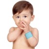 Our Teething Wrist Band slides over baby's arm to create a handy teether, leaving baby's hands free! This soft cotton band features a sewn in, food grade silicone bump and ridge designed teething plate to soothe tender gums. Fits babies wrist from 3 months and up. Machine wash gentle cycle. Lay flat to dry. Soft gray and aqua color silicone teething plate. BPA and latex free.