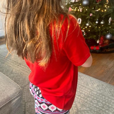 [This review was collected as part of a promotion.] My daughter wears a size medium T-shirt. This size medium T-shirt fit her well with a little room to grow. This is such A cute T-shirt for the winter season. The bright red color is beautiful and the lettering on the T-shirt really pops. My daughter loved the way the T-shirt felt on her skin. I would definitely recommend getting the matching bottoms that go along with the T-shirt.
