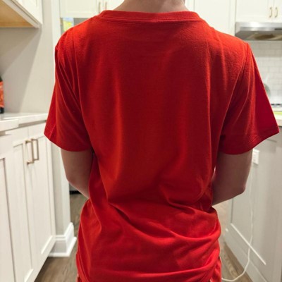 [This review was collected as part of a promotion.] We ordered this shirt in a youth size medium. The fit on it is perfect. The sleeve length is good, it’s got plenty of room across the shoulders and the overall length of it is great. It’s a nice bright red color that pops. The material is lightweight and buttery soft on the skin so it’s comfortable. This is the perfect shirt to lounge around in at home. My daughter loves it.