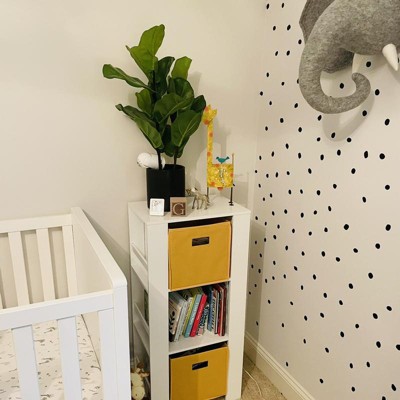 The yellow bins are nice to hide all the weird-shaped toys. This is just what we needed for a corner bookcase. Wish it was also offered in a 5-shelf option, but I see how it’d be perfect height for a tiny human at just 3. It’s an easy assembly. Perfect piece for baby/toddler storage solution.