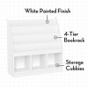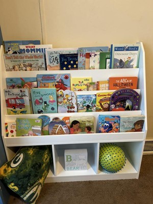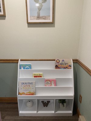 Our RiverRidge Kids Playroom Book Rack with 3 Toy Organizer Cubbies and 4 bookshelves effortlessly organizes books, games, puzzles, and toys, keeping everything neatly in its place. The shallow bookshelf design allows easy reach for small hands, while the cubbies provide ample space for larger items. Featuring a smooth white painted finish this toddler room furniture piece seamlessly blends into any decor. Its size measuring 35 x 36 x 11.1 , ensures it won't overwhelm the space. Add a pop of color by pairing it the included folding fabric storage bins, creating a visually appealing and functional storage system. Our Kids Book Rack is designed to foster a love for reading and imaginative play. With books and toys within easy reach, your child can explore their interests and develop their cognitive and creative skills The sturdy construction ensures durability making it a reliable companion throughout their early years.