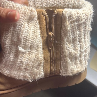Perfect for school or weekend adventures, these Keiko Faux-Suede Style Boots from art class™ bring style to every occasion. The ankle boots are sure to keep your child's feet comfy all day long thanks to their cushioned insole, soft lining and textured outsole, and the 1.25-inch platform heel adds a little lift to their height. Featuring a classic tan-color faux-suede construction contrasted with a cream-color sweater-knit shaft accented with bows, the closed-toe boots sport a side zipper for a secure fit.
