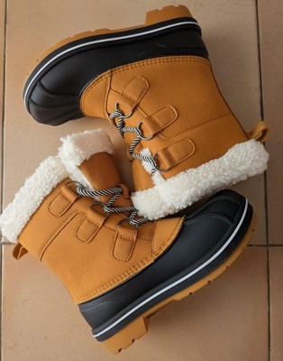 Step up their footwear closet with these Kit Easy-On Winter Boots from Cat & Jack™. These easy-on winter boots feature a polyurethane-blend upper with soft faux-fur lining and water-repellent qualities to keep their feet warm and dry. A lace-up closure and back loop complete the look and offer easy on and off.