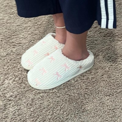 [This review was collected as part of a promotion.] My daughter wears a size 13 slipper. These size 13 slippers were a little small on her so I would recommend going one size up. The slippers themselves are absolutely adorable with a little pink bows on them. My daughter loved how soft and comfortable they were inside. She also loved the slip and style of the slipper. I loved that there was a good grip on the bottom of the slippers. These are the perfect slippers for the fall and winter seasons.