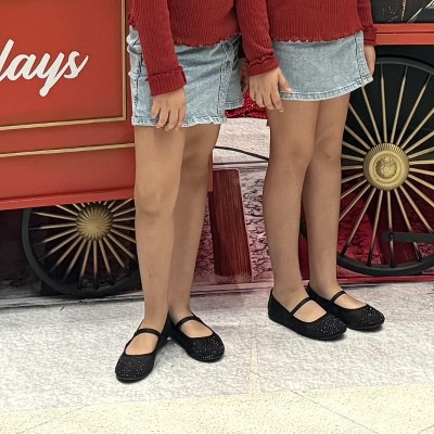 [This review was collected as part of a promotion.] My daughter overall likes the Sybil Ballet Flats in Black. She ordered her normal size (5) and they fit pretty well, her only complaint is there were a little narrow. They were easy to slide right on. The gems add a cute touch and make them perfect to pair with a holiday dress or a choir/band concert. She liked them much better than plain black flats.