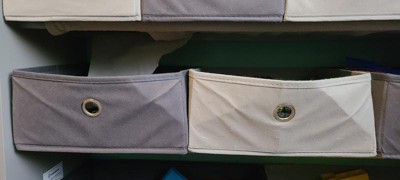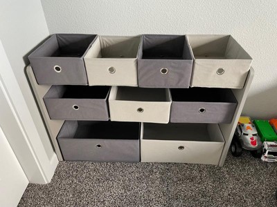 [This review was collected as part of a promotion.] I got this Humble Crew Camden Fabric Multi Bin Toy Organizer with 9 Storage Bins for my 2 boys to store their toys in. It's a good size at 3ft across, just over 2ft tall to top of bins and 1ft deep. I love that there are so many, different sized bins for a more organized storage solution. It was pretty easy to put together following the directions that were included. Only needed a couple of tools and did it by myself. At first I thought it felt a little wobbly, but after placing it in my boys' room and loaded it up with toys, it felt pretty sturdy. After 6 months of use, my only issues were with the thickness and quality of the paper-like fabric "shelves", the top one ripped within the 1st month of use, and the durability of the fabric bins. None of the bins have broken or ripped, but the cardboard sewn into them gets misshapen very quickly. Except for the bin's bottom insert, they are thicker and definitely more sturdy.