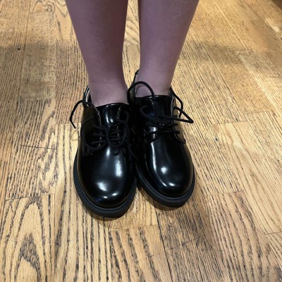 [This review was collected as part of a promotion.] My child is wearing a size one in these Oxford dress shoes from cat and Jack. They fit them great it was a true to size fit. The shoes do tie and the black was very shiny. Will be great to wear to school if you need to dress up or to church. The souls were nice and thick a perfect bottom for not slipping when walking. Very easy to put on and takeoff. The shoe strings were plenty long to allow easy tie. I received an incentive to write this review.