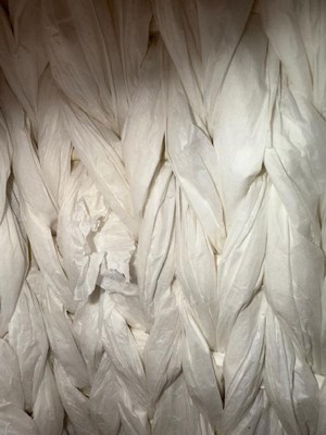 A: The book storage is made from paper with a weave pattern.