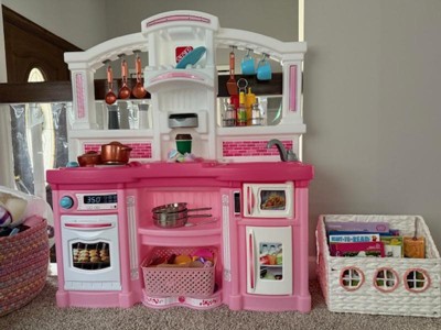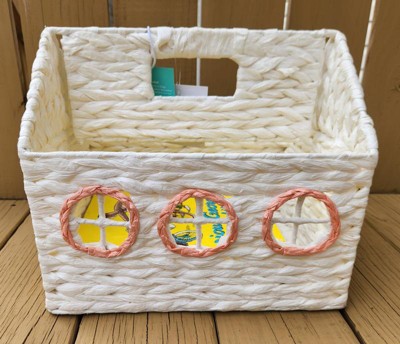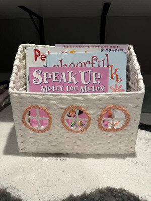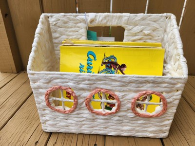 My daughter always has a pile of books next to her bed, and I thought this would be great to help keep them tidy. Currently we are using it to hold library books. It holds about ten comfortably, with room for more. My daughter loves the cute design and has used it to store her stuffed animals, and even carried it around like a purse. I am a little concerned that the weave won’t hold up over the years, and with it being white, I wouldn’t move it around too much.