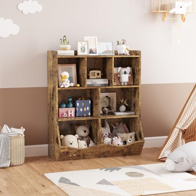 Kids Bookcase 3-Tier Storage Organizer, Gray Freestanding Kids Bookshelf with Open Compartments & Toy Bins for Nursery, Playroom & Bedroom
