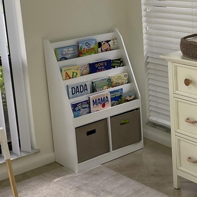 The RiverRidge Kids Book Rack with Two Cubbies is the ideal kids bookshelf and toy storage solution for any room. Its versatile design features four horizontal Book Racks and two cubbies, creating a stylish book nook and toys organizer storage for kids play rooms. Its white painted complements any decor while keeping items neatly organized. Keep your child's toys and books within reach with our compact toy storage shelf. Our book storage for kids is designed at the ideal height for little ones to access their treasures. The two cubbies provide ample space for larger toy storage, while the bookshelves neatly display books and smaller items for easy kids book storage. Our Kids Book Rack is an ideal toy organizer and kids playroom furniture piece. Its sturdy MDF construction ensures durability for years of use. The included folding fabric storage bins create a complete cubby storage organizer solution for keeping your child's space tidy.
