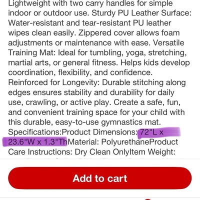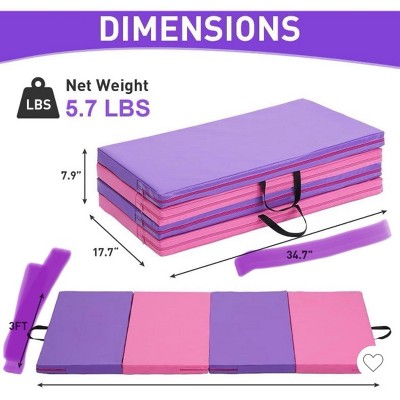 Kids Foldable Tumbling Mat for Home Workouts, 2-Inch Foam Gymnastics Mat with Carry Handles, 2x6ft or 4x8ft, Yoga, Stretching, Martial Arts, Pink/Purple Product Description:Give your kids a safe and fun space to move with our premium foldable tumbling mat. Designed for home workouts, gymnastics, yoga, and martial arts, this mat combines comfort, durability, and convenience. Key Features: Premium 2-Inch Foam Padding: High-density EPE foam cushions impacts while providing a supportive surface for jumps, rolls, and stretching exercises. Perfect for active play or structured training. Space-Saving 4-Panel Design: Folds into four compact panels for easy storage. Lightweight with two carry handles for simple indoor or outdoor use. Sturdy PU Leather Surface: Water-resistant and tear-resistant PU leather wipes clean easily. Zippered cover allows foam adjustments or maintenance with ease. Versatile Training Mat: Ideal for tumbling, yoga, stretching, martial arts, or general fitness. Helps kids develop coordination, flexibility, and confidence. Reinforced for Longevity: Durable stitching along edges ensures stability and durability for daily use, crawling, or active play. Create a safe, fun, and convenient training space for your child with this durable, easy-to-use gymnastics mat. Specifications:Product Dimensions: 72"L x 23.6"W x 1.3"ThMaterial: PolyurethaneProduct Care Instructions: Dry Clean OnlyItem Weight: 6.28 PoundsColor: Pink+Purple Package List:1 x Foldable Tumbling Mat