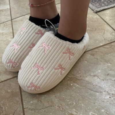 These Landry Scuff Slippers from Art Class™ will wrap your child's feet in cozy comfort and cute style. These cream-color scuff slippers are adorned with embroidered bow motifs in light pink for a pretty look. They boast a closed-toe fabric upper, comfy insole and lining for all-day comfort. The slip-on style with an open back, paired with an indoor/outdoor outsole, completes the look and makes these slippers perfect for all-purpose wear.
