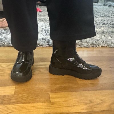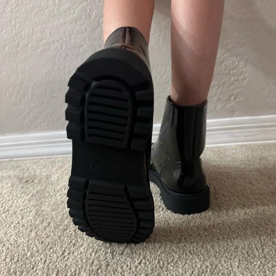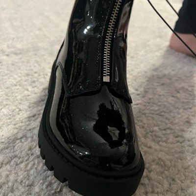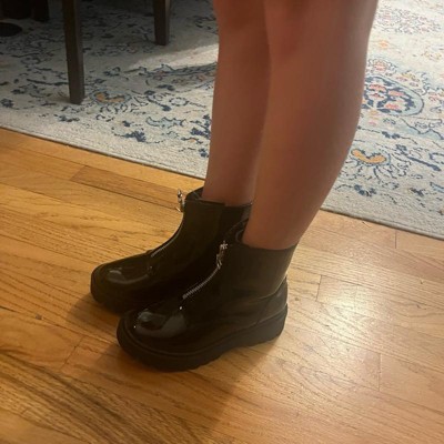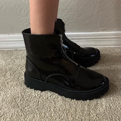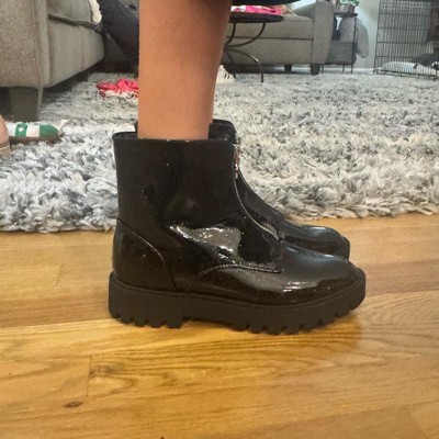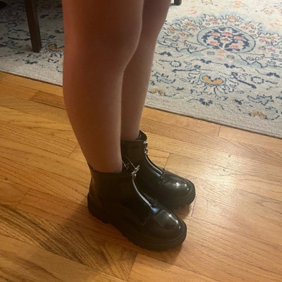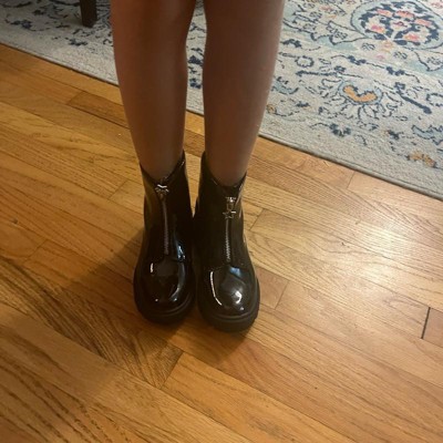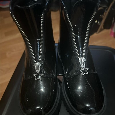 [This review was collected as part of a promotion.] We love these shiny black boots they are so cool and fashionable. They are perfect for fall and winter and go with so many outfits including jeans and dressses. They would also look super with opaque tights. The zip up the center is functional with an eyecatching star zip pull. My 9 year old daughter is wearing a size 4 and they fit her perfectly. Great to wear with Halloween costumes or every day wear for all ages.