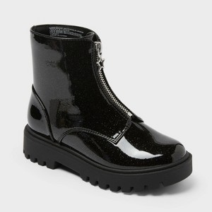 Elevate your child's shoe collection with these Myra Chelsea Boots from art class™. These closed-toe boots have a faux-patent upper in a versatile black shade with a speckled finish that adds a hint of shine to their steps. Set on a textured outsole and cushioned insole, these medium-width boots are finished with a silver-tone zippered fastening down the front accented with a cut-out star pull for comfortable wear and a standout look.