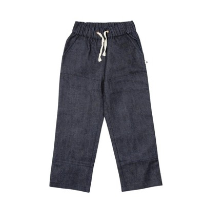 Straight-leg pants with worker-style reinforcement in a durable, mid-weight organic cotton chambray (240 gsm). Unlike the ultra-light versions you might expect, this chambray has a sturdy feel thanks to its denser weave—perfect for rough-and-tumble play. The color is a warm, reddish orange with subtle white threads woven in, creating a soft, peachy tone that adds dimension and richness. Designed for active kids: elastic drawstring waist for easy dressing, extra-long legs for those growth spurts, and reinforced knees. Designed to fit 2x longer.