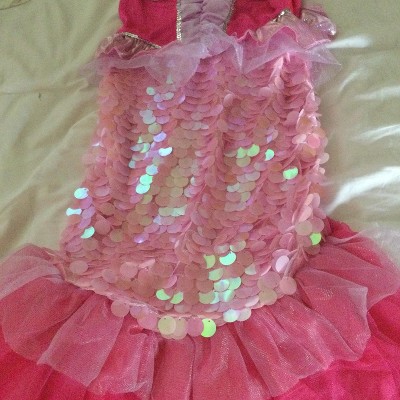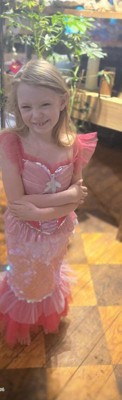 I loved this mermaid dress for my girl. It is such a a pretty style. I love the different shades of pink in it and the shiny scales. It was very easy to get on and off. The fit was perfect and true to size of a girls 10/12 size. The length is perfect so it doesn't drag on the floor and the cute shell clip was perfect.