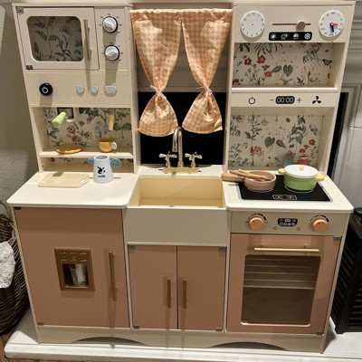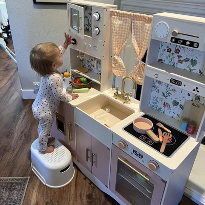 This kitchen is so adorable!!! I looked for months and finally found this one! I did add a wildflower peel and stick to the backboard to make it more whimsical. Grand baby is 16 months and it is a little tall for her so just had her use a step stool but she played and played for hours and the accessories are so pretty too!