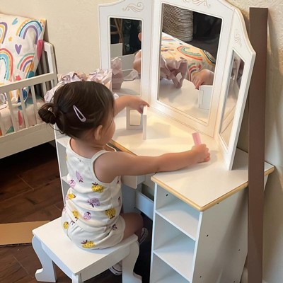 Kids Vanity Set with Mirror and Stool, Wooden Girls Makeup Playset, Princess Vanity Table for Kids, Toddlers, White