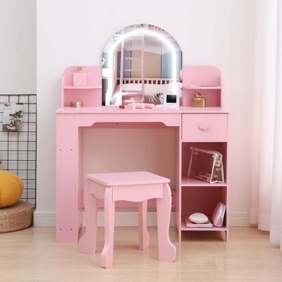 Kids Vanity with Lighted Mirror, Little Girls Vanity Table & Stool with Tri-Fold Mirror, Makeup Dresser with Drawer & Storage
