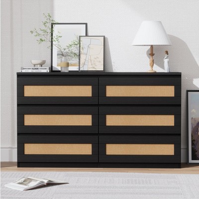 KIGFTSOD 59" Rattan Dresser with Drawers, 6 Drawer Dresser for Bedroom,Black