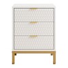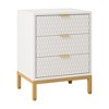 - Bring refined style and practical storage to your space with this modern 3-drawer white and gold nightstand. Designed with clean lines, a textured hexagon front, and a luxe metallic base, this tall bedside table instantly upgrades any bedroom or living area. The 25.8-inch height makes it ideal next to taller beds or sofas, while the three spacious drawers offer ample concealed storage for books, chargers, and daily essentials.