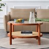 This coffee table is a perfect blend of modern design and functionality. The solid wood frame gives it a natural and sturdy feel, while the crafted glass top adds a touch of elegance. The double-layer design offers plenty of storage space for your essentials. The PE rattan on the second layer adds a unique texture and charm. The round shape and smooth edges make it not only a practical furniture piece but also a stylish addition to your living room. It is easy to assemble and suitable for everyday use, enhancing the beauty and convenience of your home.