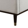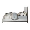 - This queen bed in light gray fabric brings elegance and comfort to any bedroom.