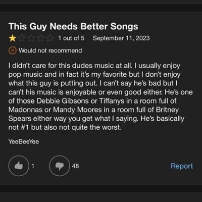I didn’t care for this dudes music at all. I usually enjoy pop music and in fact it’s my favorite but I don’t enjoy what this guy is putting out. I can’t say he’s bad but I can’t his music is enjoyable or even good either. He’s one of those Debbie Gibsons or Tiffanys in a room full of Madonnas or Mandy Moores in a room full of Britney Spears either way you get what I saying. He’s basically not #1 but also not quite the worst.