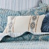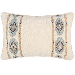 The Blue Embroidered Medallions on Cream decorative pillow matches perfectly with the Levtex Home Kimpton Navy bedding collection. This pillow is sized at 12 x 24in. and features an intricately embroidered medallion design on a cream ground. The cream with taupe and blue color palette makes this a versatile accessory for your bed, couch or favorite chair. The pillow comes pre-filled with a soft, luxurious feather inner.