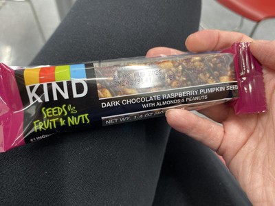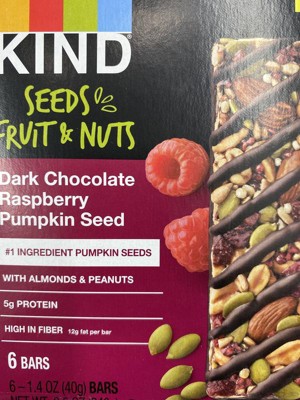 - Six 1.4-oz KIND bars, Seeds Fruit & Nuts Dark Chocolate Raspberry Pumpkin Seed gluten free snack bars