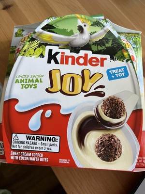 Bring the excitement of the animal kingdom home with Kinder Joy Natoons eggs. Discover two sides of fun with this Kinder Joy Egg. The treat side of the egg features two layers of creamy deliciousness–one cocoa and one sweet cream. Plus there are two crispy, chocolately-covered wafer bits filled with cocoa cream. The toy side of the egg hides a surprise Natoons animal figure, making these eggs perfect for kids. Individually wrapped and easy to enjoy on the go, Kinder Joy Natoons eggs are the perfect mix of delicious flavor and educational fun for kids of all ages.