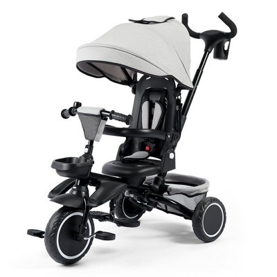 Kinder King 7-in-1 Kids Tricycle with Canopy, Adjustable Push Handle, One-Touch Brake, Lockable Front Wheel, All-Terrain Tires & Storage, Black