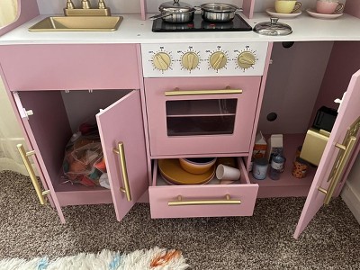 Very cute. Very realistic. Not very durable. The part that holds all the knobs for the oven and holds the oven door on was very flimsy once put together. It’s a very thin piece of pressboard. After several times of my children opening the oven and closing the door back that panel is broken and the oven door has nowhere to latch on because of the broken panel. No way to replace that part without taking the entire thing apart and returning it. It’s so cute! We had high hopes for it. But for one day of play it’s definitely not worth the price.