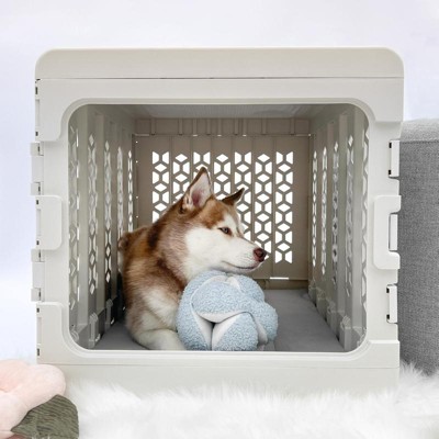 It’s absolutely adorable and looks cute in a room, but overall it’s a no for us. The plastic feels like a container I would store in the attic. The door latching mechanism feels like it could break at one wrong bend. And if your dog would happen to have a messy #2 the amount of cleaning the inside would take wouldn’t be worth it. Finally, the price point for the quality doesn’t match in my opinion. I’d love to see this in a thicker & sturdier material, and the inside be a smooth wipe able surface without all the holes and grooves.