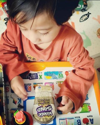 [This review was collected as part of a promotion.] My son loves playing with this kinetic sand mummy tomb and toy. With a little bit of help from me, he was able to open the tomb and dig in. As he loves to play in sand and dirt, kinetic sand is a good option as it allows him to play and use sensory and tactile development. It is great for me as I do not have to clean a mess. It was easy to pack back up after he found his gems and now hes asking for more. I would definitely recommend this.