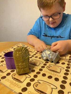 [This review was collected as part of a promotion.] Kinetic Sand Mummy Tomb is a fun sensory experience! When you first open the package you reveal one of 3 possible Mummy molds. You can use the shovel tool on the back of the package to open it up using the crowbar handle. Once you remove the mold, you use the shovel to dig down into the Kinetic Sand to find another tool, a small statue, and a prize (we got a gem). You can reshape the molds over and over again to rebury the treasures, as the sand is very stretchy and never dries out!