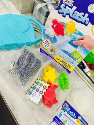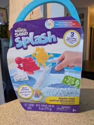 We are huge kinetic sand fans, but this was a bust. My kid had to have this after seeing all of the commercials. Pros: The price was right. We like the carry case and molds. Cons: color change was disappointing. The sand went from light gray to dark gray. Not the bright blue as advertised. The consistency once wet was advertised as a new sensory experience, but it feels like gum or wet play-doh. The original kinetic sand texture and colors are way better. Also, beware that you're not supposed to mix regular kinetic sand with the kinetic sand splash, which is difficult to do if you have a big collection as we do.