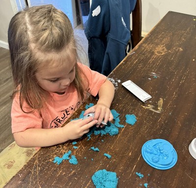 This is a fun little toy, especially for the cheaper price. The whole thing is well thought out and every piece can be used. I like that it has a cute character with an actual purpose, and the instructions show you how to use it. There isn’t a whole lot of sand inside, but it’s a good amount for our three year olds not get overwhelmed. The lid is hard to get off and back on, I was nervous to store the sand in the original container because it didn’t seal the whole way. But other than that we love kinetic sand!