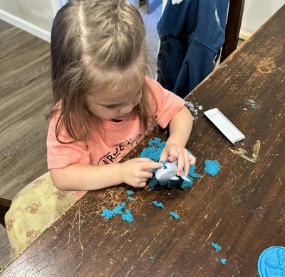 It was such a mess and completely unlike the other kinetic sand I’ve used. It crumbled into tiny sand pieces everywhere and you couldn’t easily pick it up with a glob of sand like I’m used to.